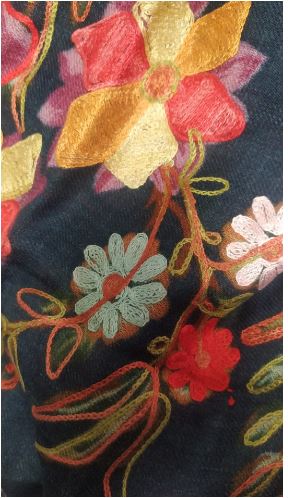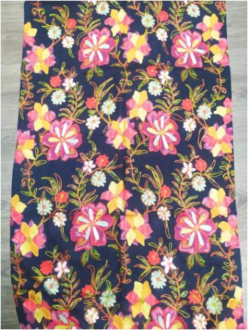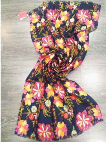 Este fular de edición limitada está bordado a mano por artesanos altamente capacitados en la India y requiere una gran cantidad de tiempo y habilidad. Los diseños se aplican a la tela utilizando un bastidor especial y un gancho de aguja, lo que resulta un patrón con textura única.