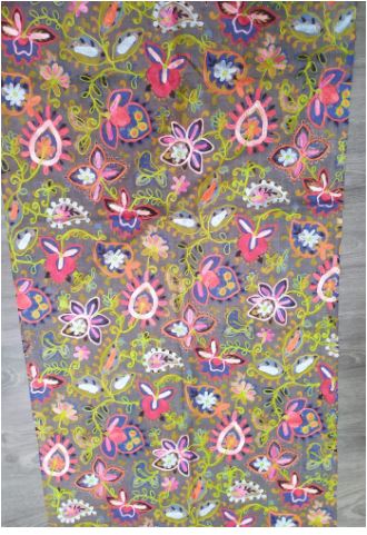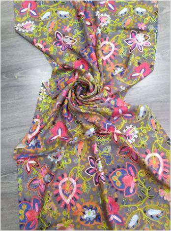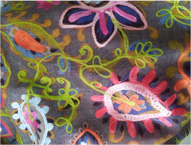 Este fular de edición limitada está bordado a mano por artesanos altamente capacitados en la India y requiere una gran cantidad de tiempo y habilidad. Los diseños se aplican a la tela utilizando un bastidor especial y un gancho de aguja, lo que resulta un patrón con textura única.