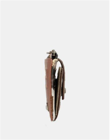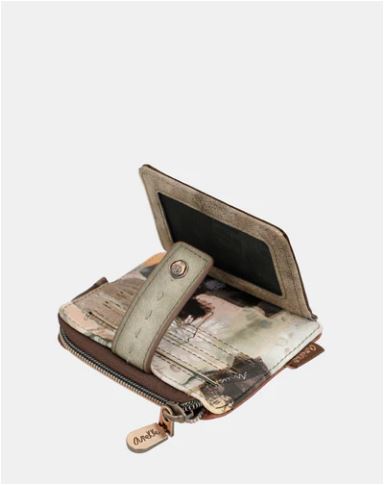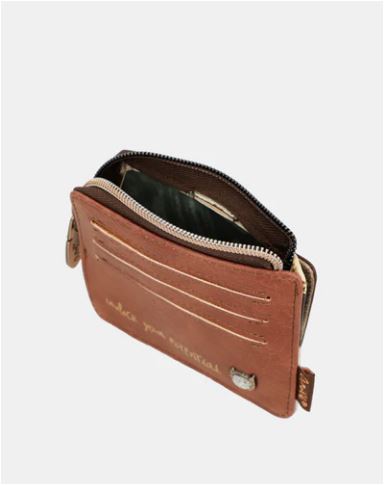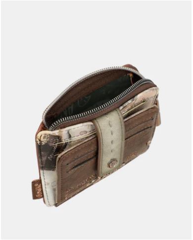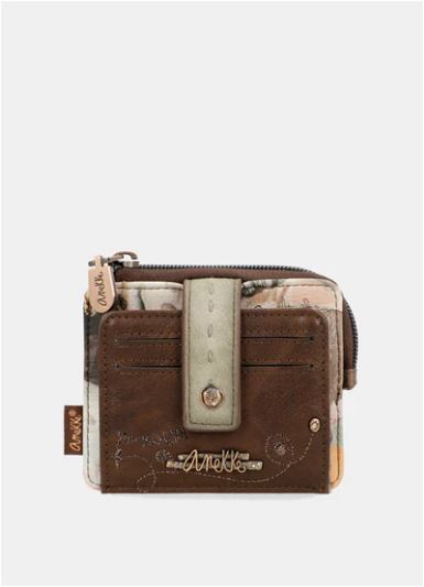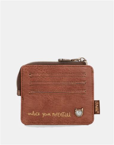 Tarjetero Outer de Anekke. Este tarjetero es de tamaño pequeño. Cuenta con dos compartimentos: uno frontal que se abre mediante lengüeta, cuyo interior alberga espacio para tarjetas, y uno superior con cremallera para monedas. El interior va forrado.