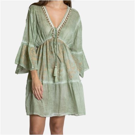 Túnica playa de Tantrend. LÍNEA NATURAL SOUL: Túnica en algodón voile. con escote en V y mangas con volantes. Dispone de tira de cordón en el escote y detalle de bordado alredededor del escote. Tiene cintura elástica .con estampado dorado en técnica block print. en un color: verde.